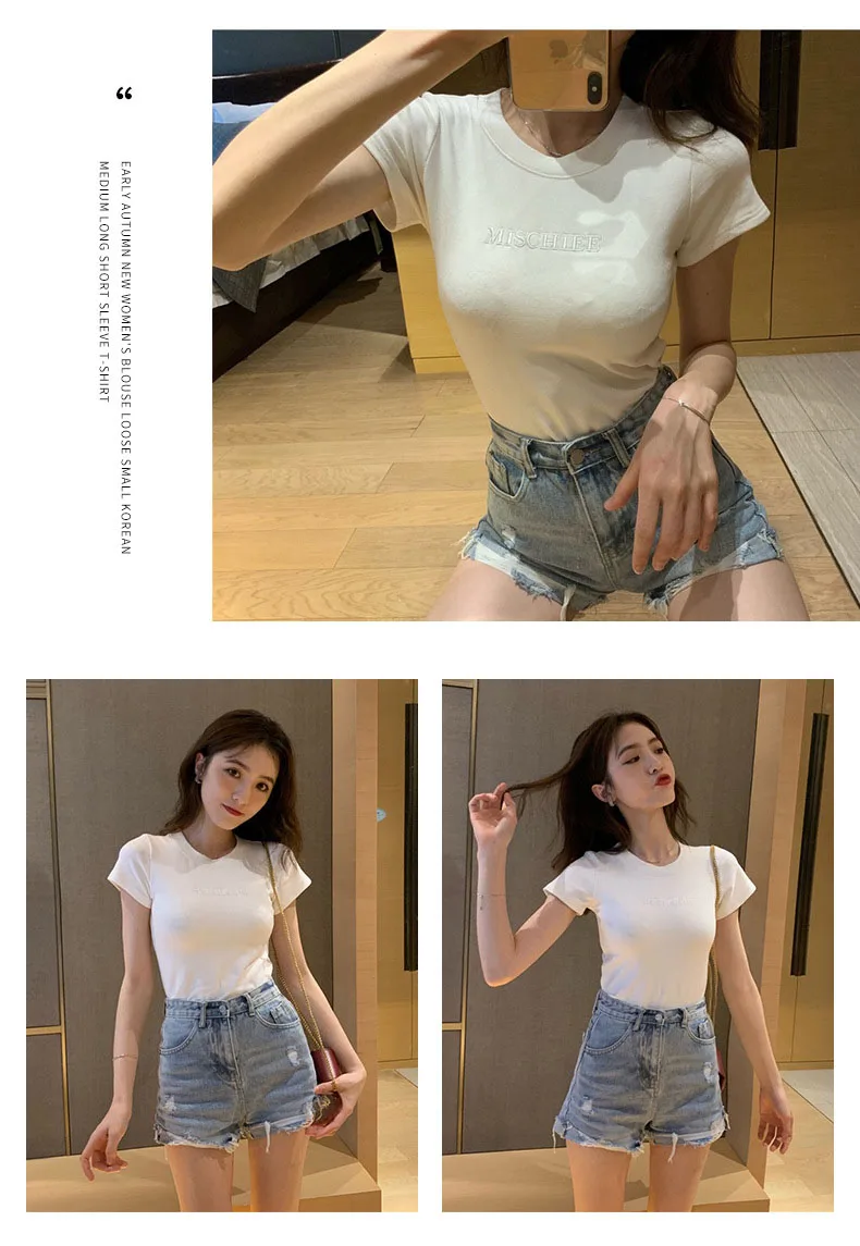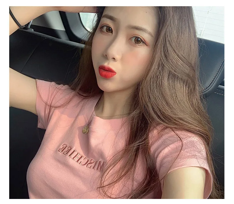 Women Short Sleeve Top Pure Ladies T-shirt Brand Letter Summer Embroidered Clothing Slim Cotton Pure Color Fashion Round Neck