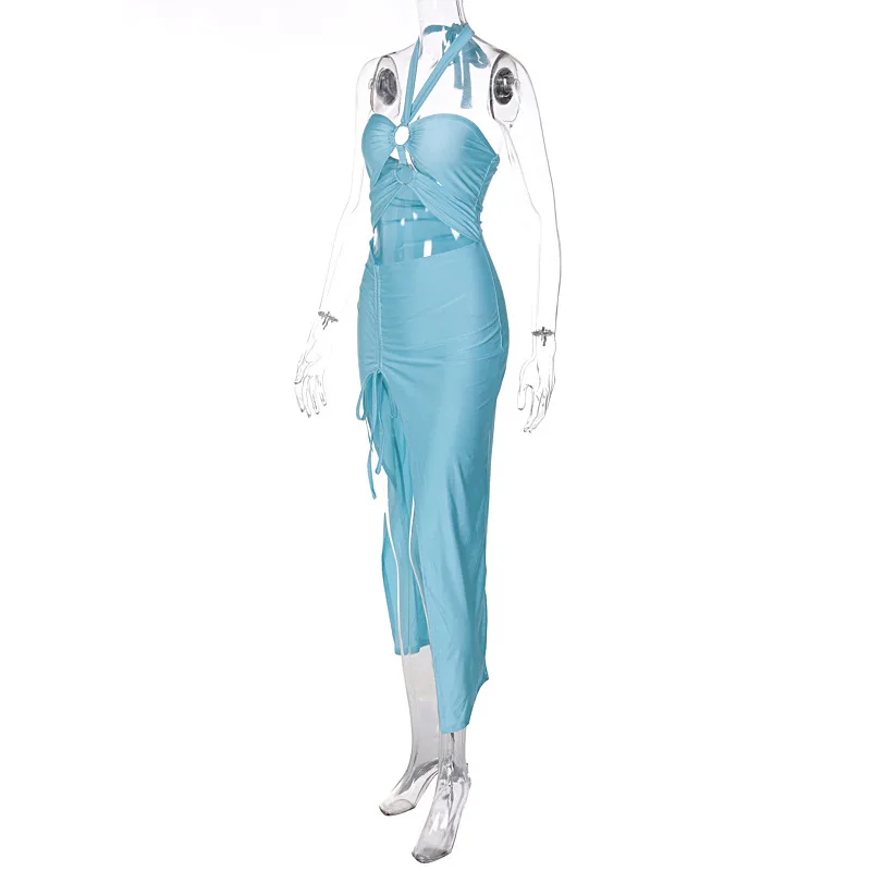 Women Solid Color Spliced Bodycon Hollow Out Collar Style Fashion Split Dress Slim Fit Party Club Evening Dress 2024