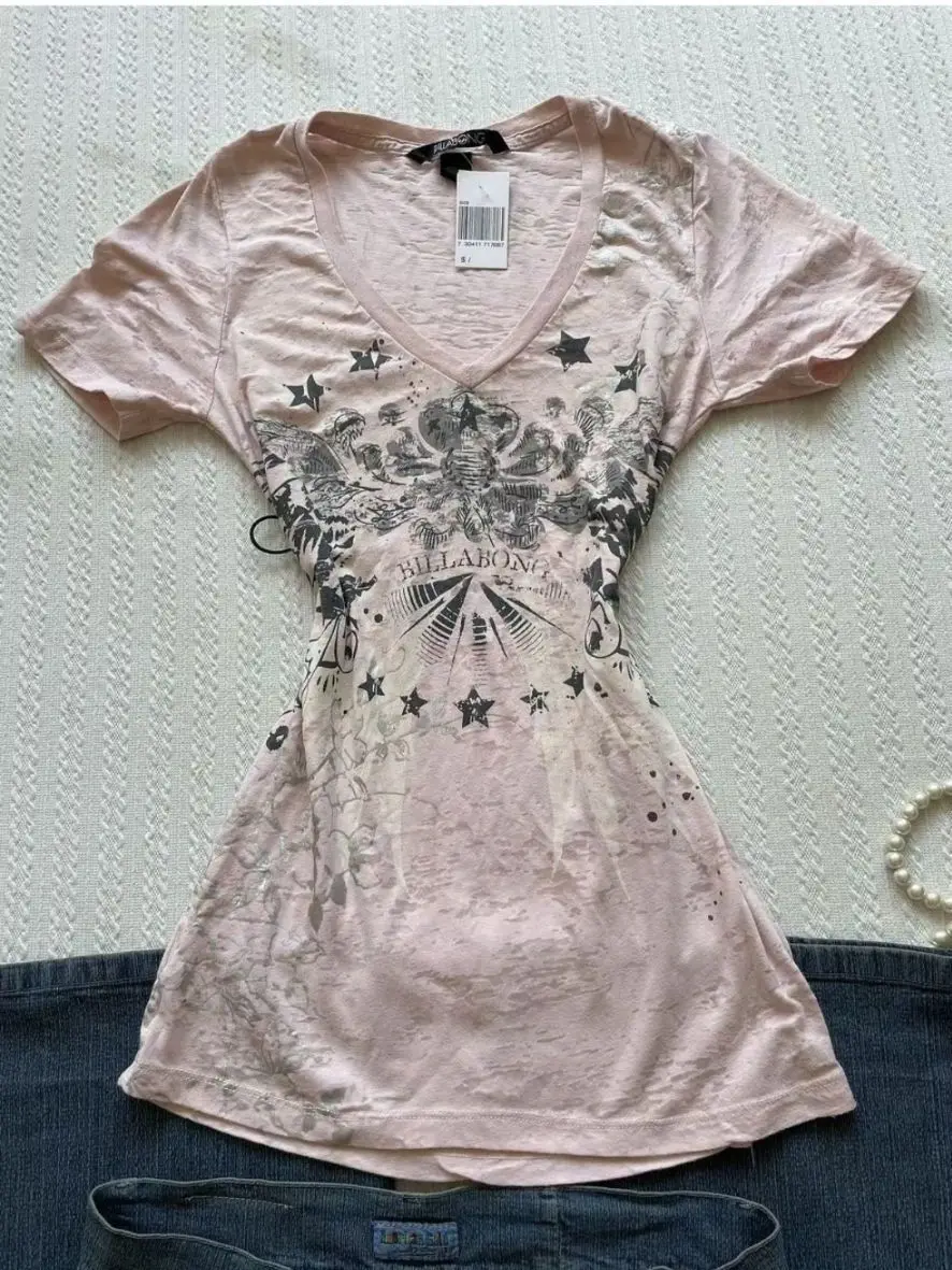Women Vintage Print All Match Slim Waist Tees Streetwear Grunge V-neck Tops Y2k Aesthetic Casual T-Shirts Female Korean Harajuku