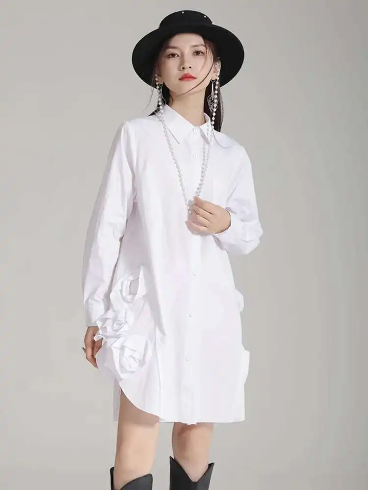 Women White Black Side Flower Big Size Long Blouse New Lapel Long Sleeve Shirt Fashion Tide Spring Autumn 2025 1DH4780