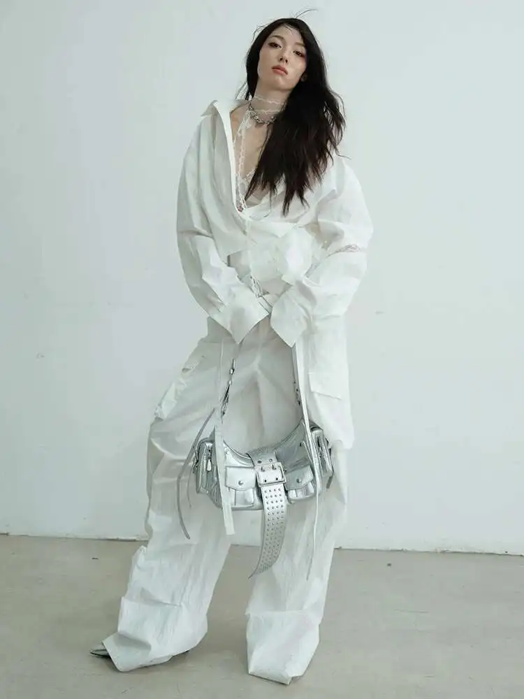 Women White Lace Hollow Out Big Size Elegant Blouse New Lapel Long Sleeve Shirt Fashion Tide Spring Autumn 2025 1DJ0688