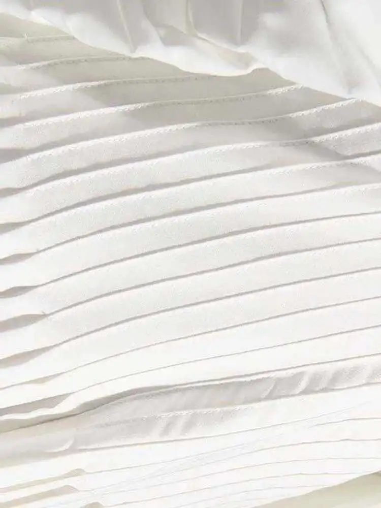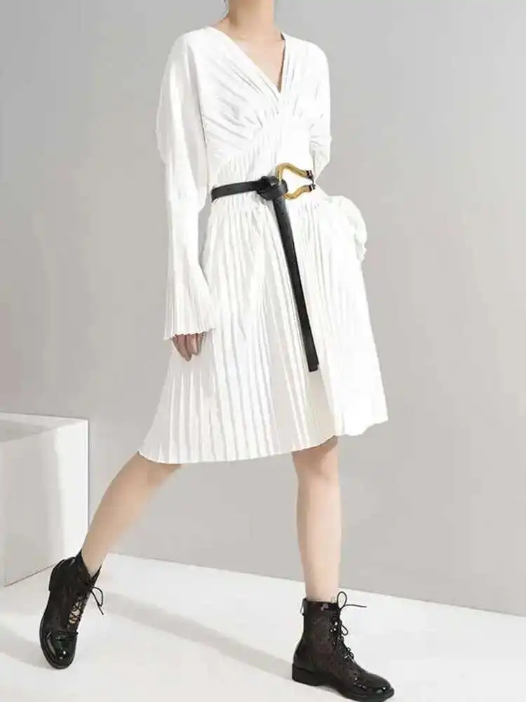Women White Pleated Elegant Big Size Midi Shirt Dress New V-Neck Long Flare Sleeve Fashion Tide Spring Autumn 2025 1W3260