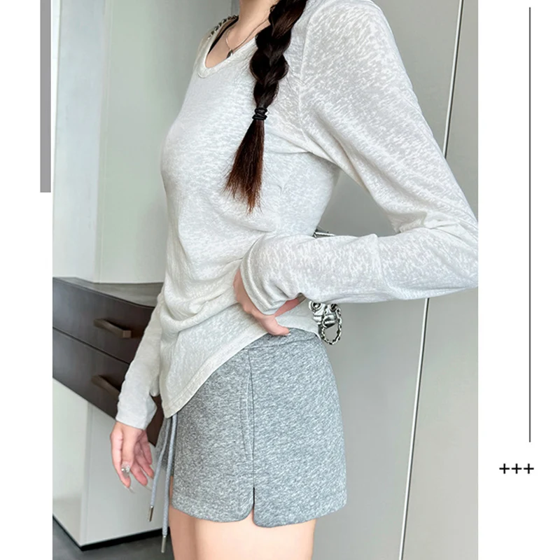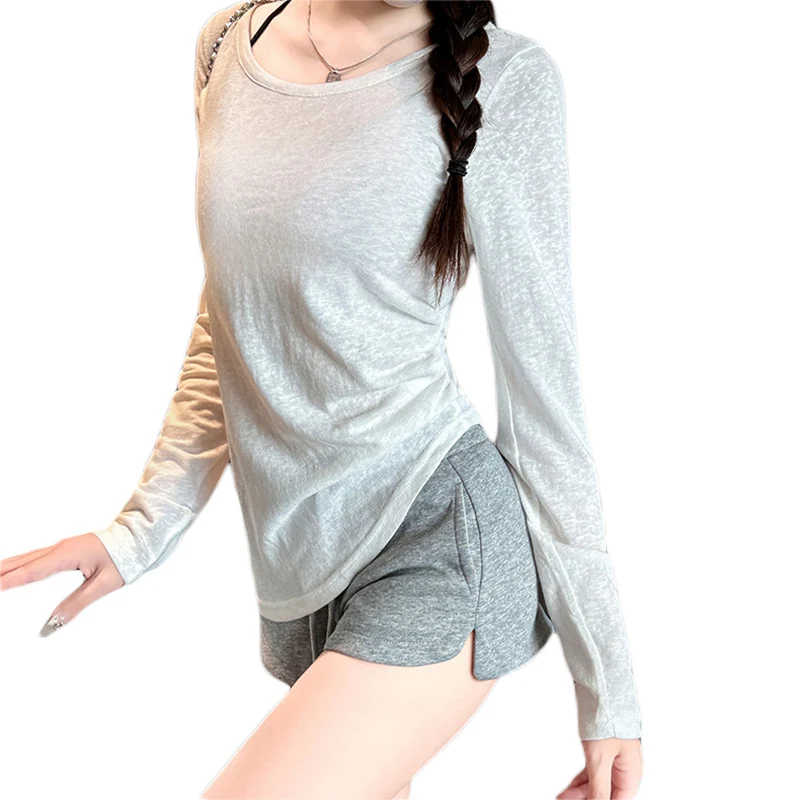 Women y2k Tops 2000s Aesthetic Clothes Solid Color Round Neck Long Sleeve Asymmetrical Hem Tee Shirts Casual Streetwear