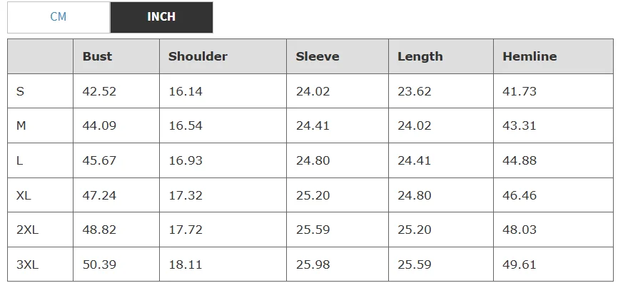 Short Jacket Size Table: