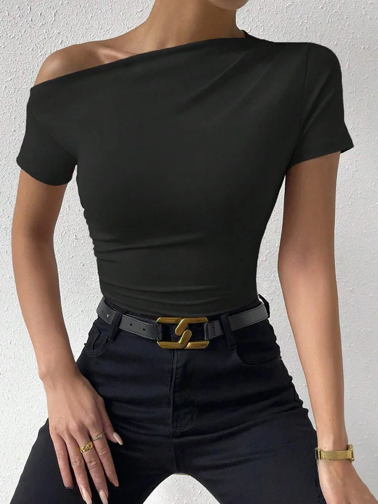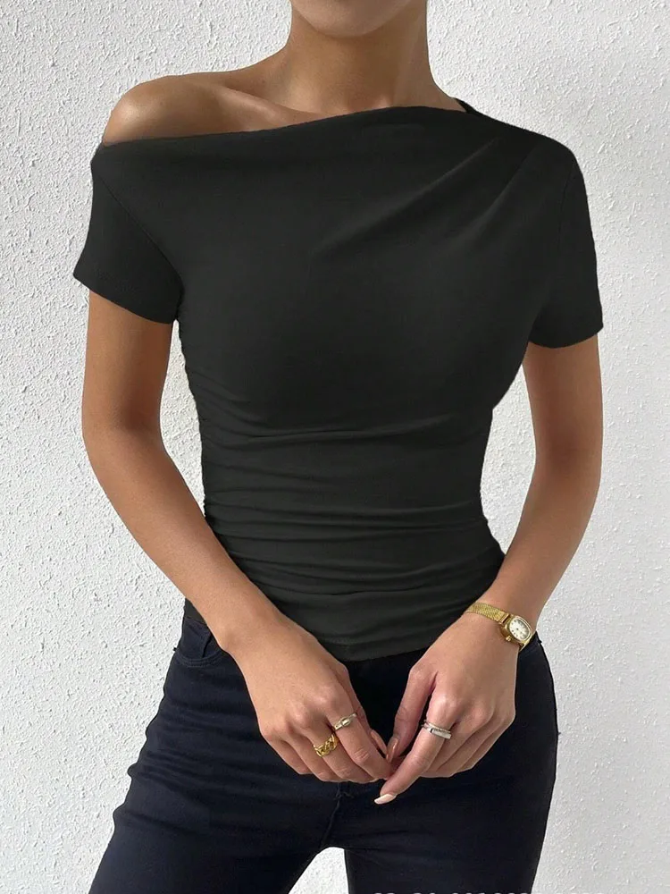 Women's One-Shoulder Ruched Short-Sleeve T-Shirt Summer Fashion Casual Solid Color Slim Fit Streetwear Top 2024
