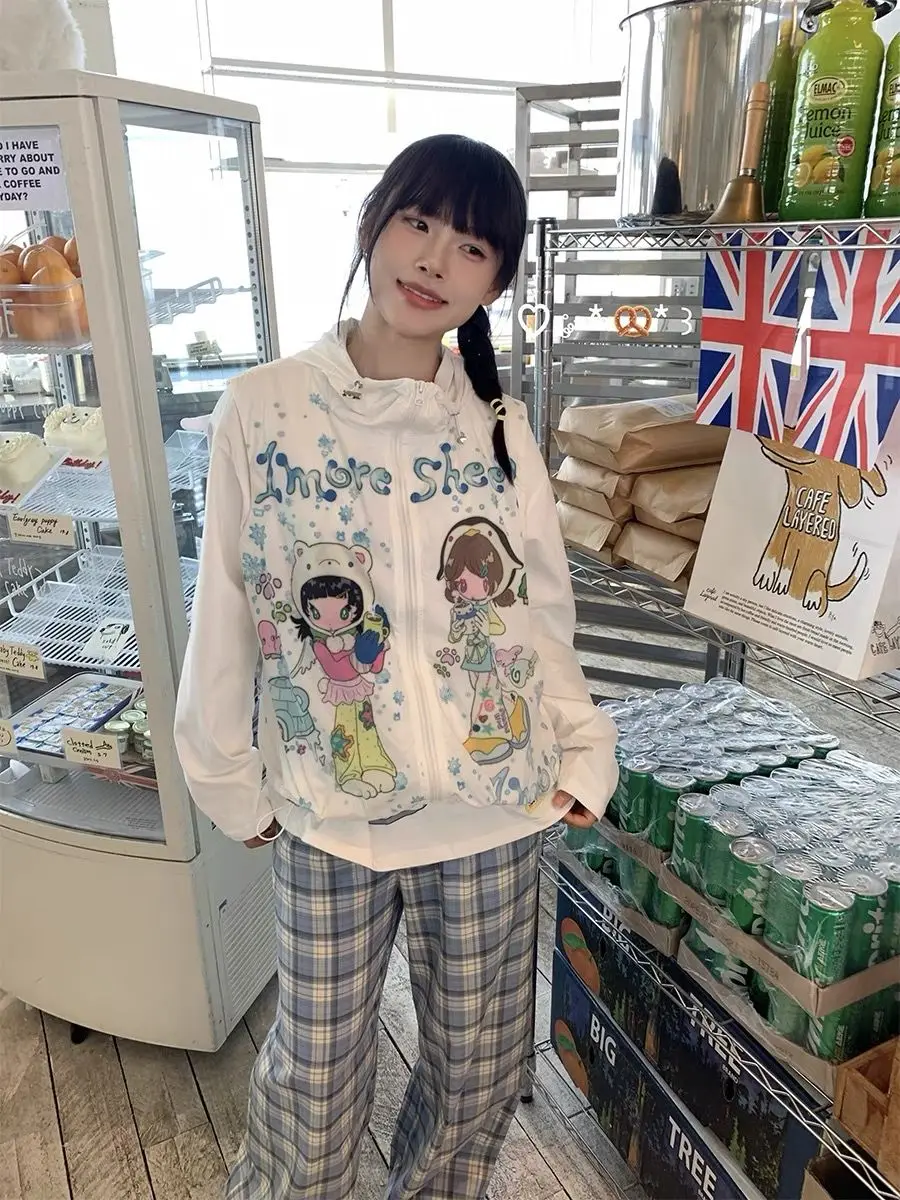 Y2k Aesthetic Cartoon Print Vest Hooded Coats Women Harajuku Casual Sleeveless Jacket Streetwear Drawstring Kawaii Cute Tops