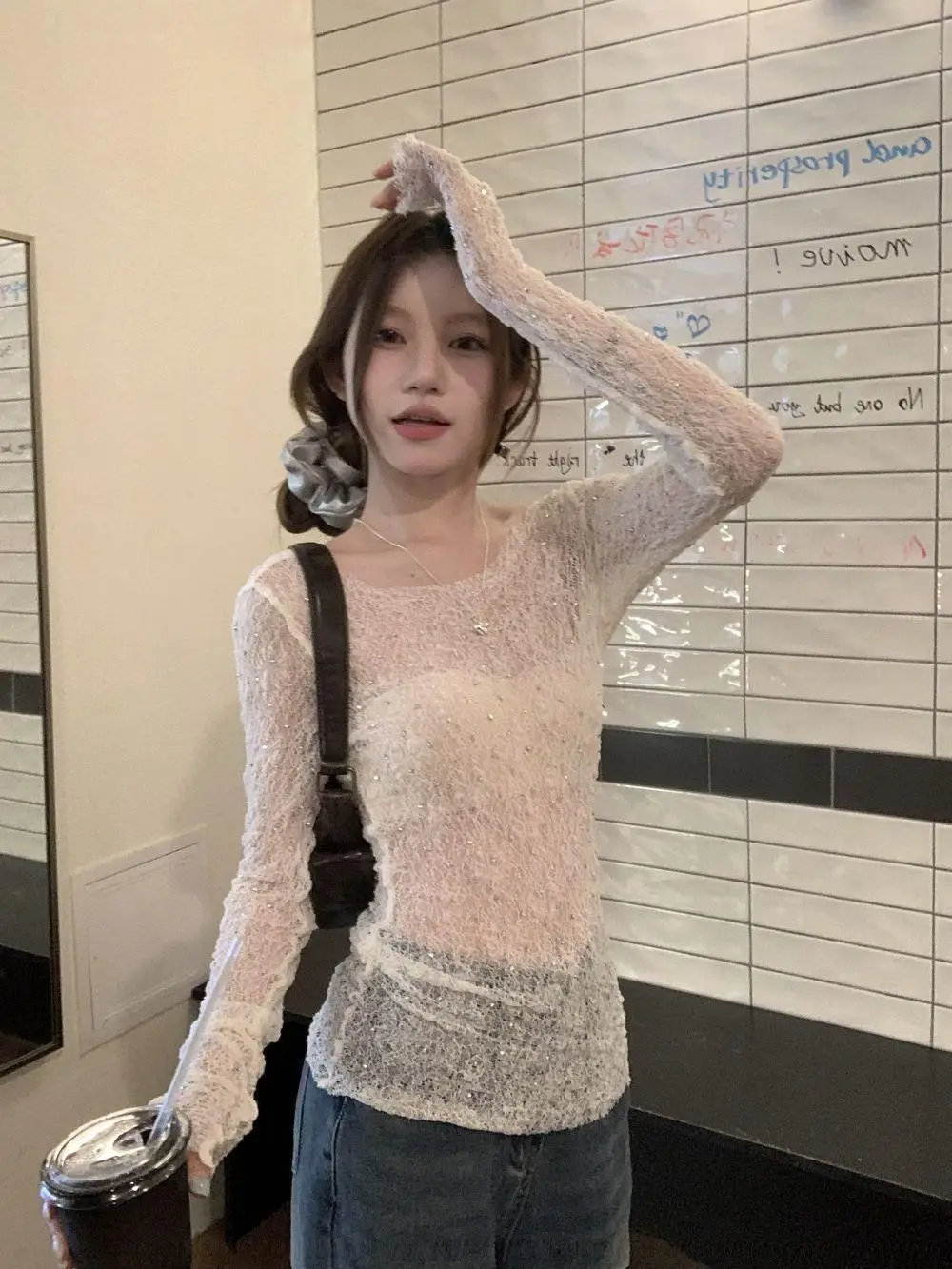 Y2k Aesthetic Hollow Out Crop Top Harajuku Slim Fit Vintage See Through Sexy Diamond T-shirt Summer Streetwear Grunge Fairy Tees