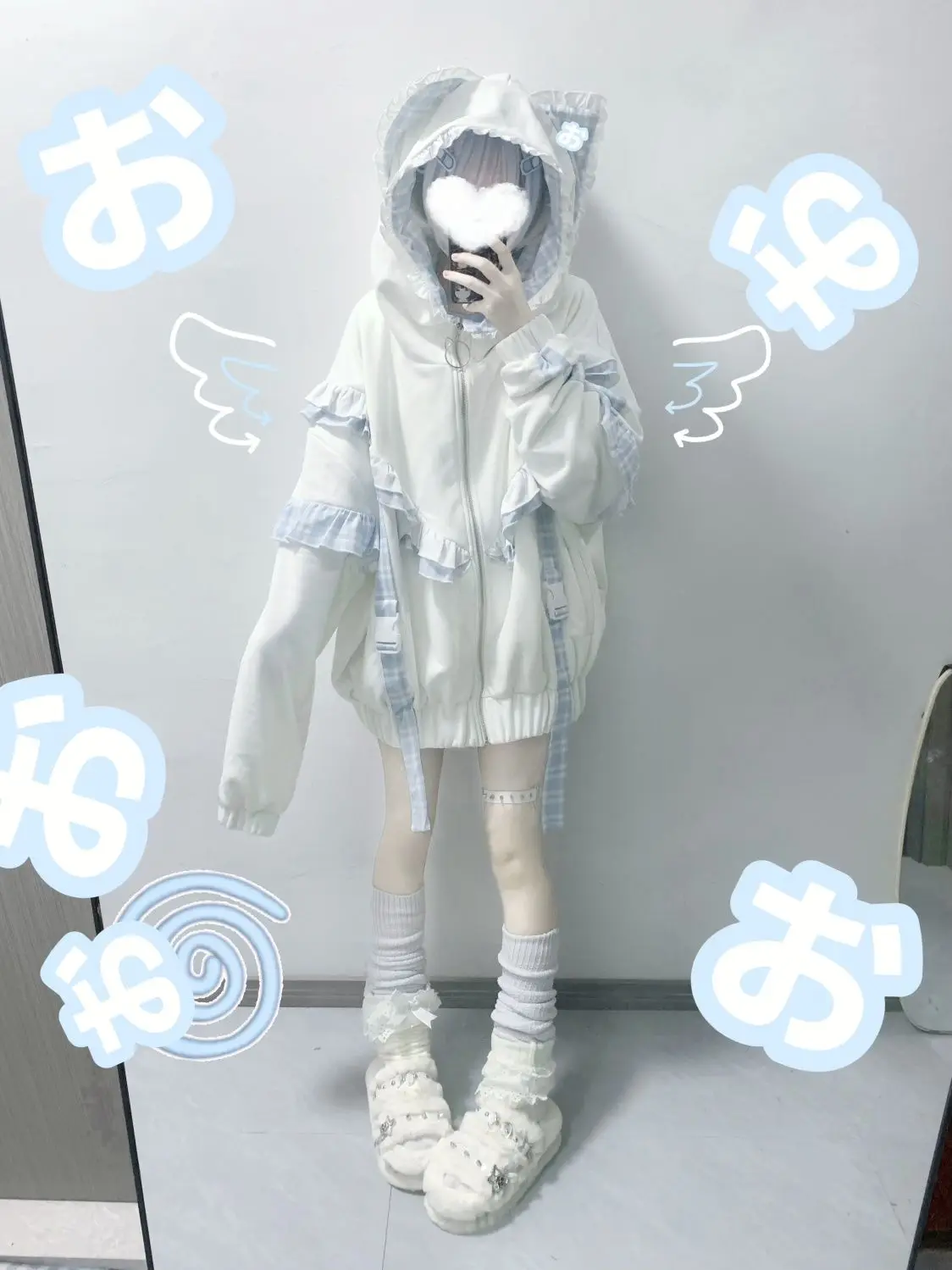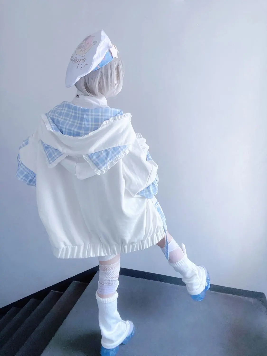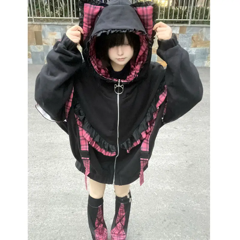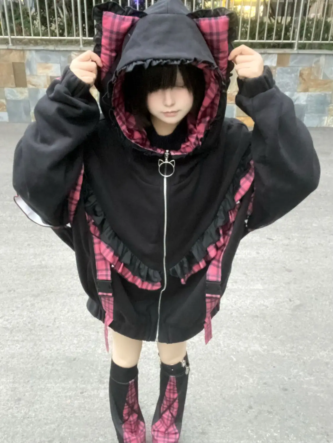 Y2k Aesthetic Lace Ruffle Plaid Hoodies Thick Y2k Jacket Women Kawaii Streetwear Harajuku Coats Casual Loose Grunge Kawaii Coats