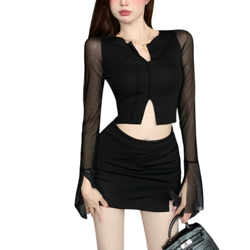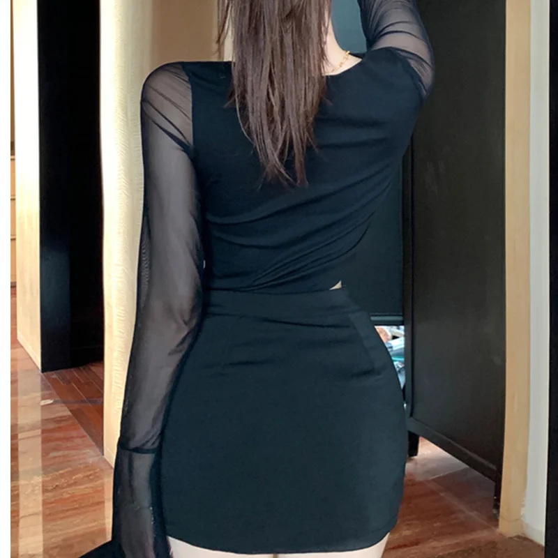 y2k Aesthetic Tops for Women Sexy Sheer See Through V Neck Long Sleeve Slit Hem Mesh T Shirt 2000s Clothing Streetwear