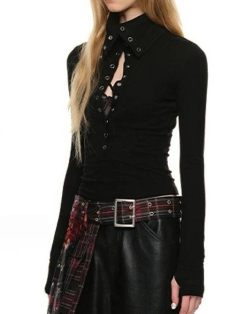 Y2k Aesthetic Vintage Solid Single Breasted Tops 2025 Streetwear Half High Collar Tshirts Women Grunge Harajuku Bodycon Tees