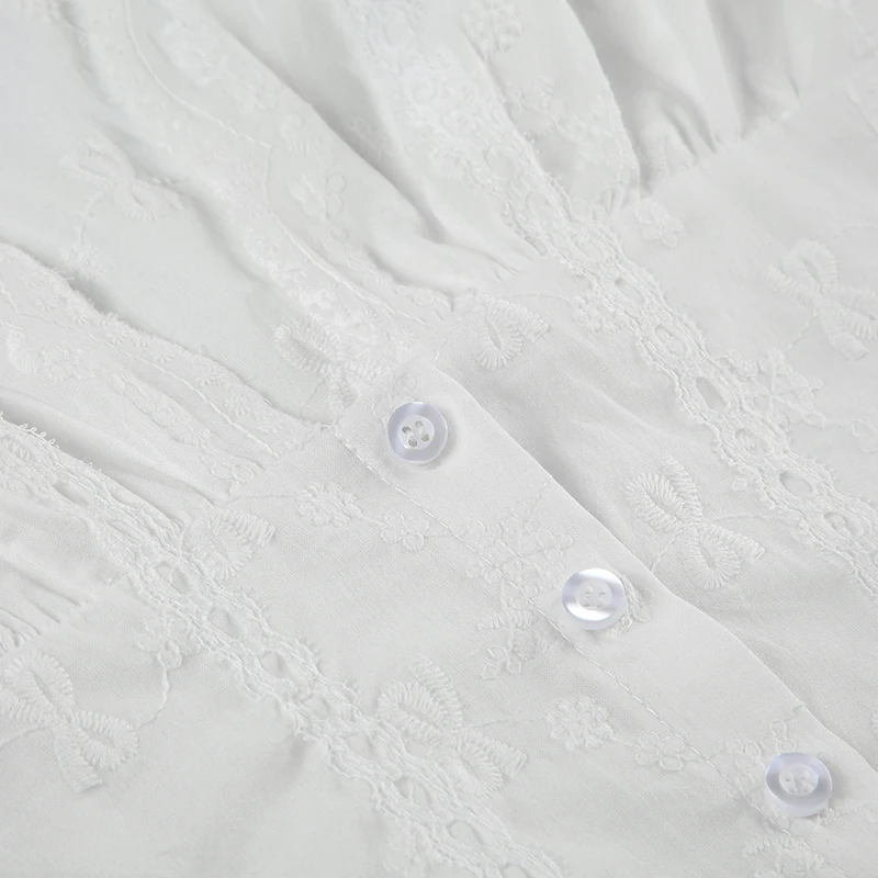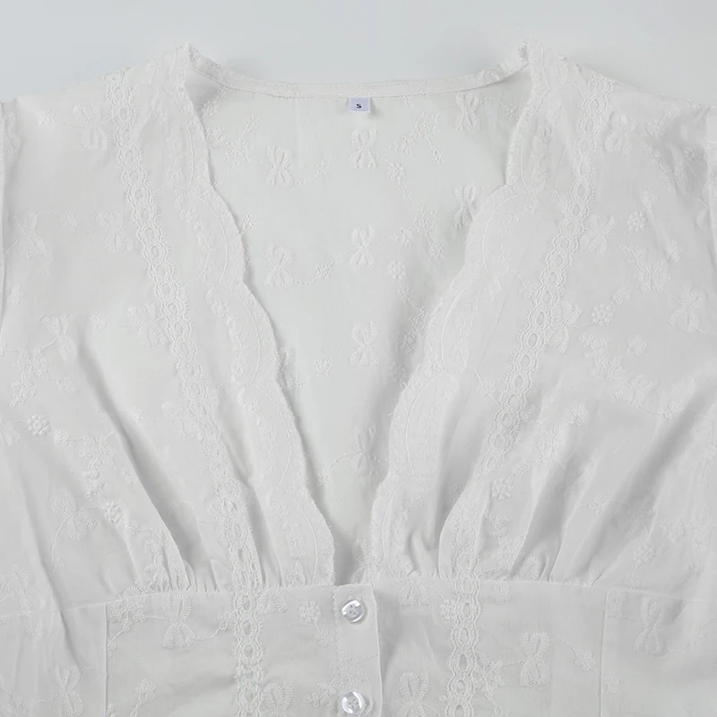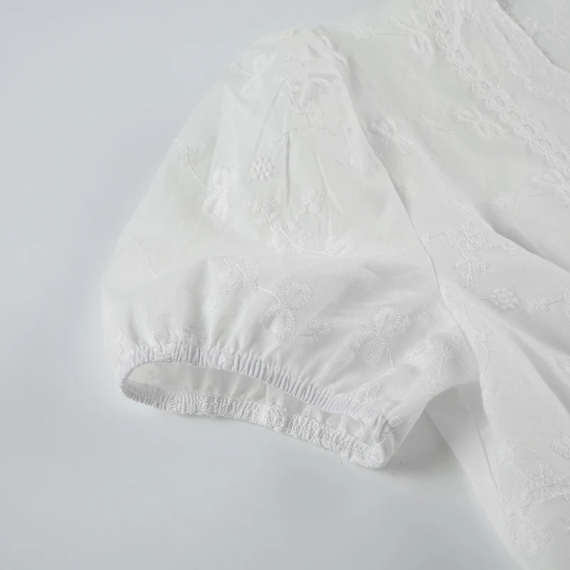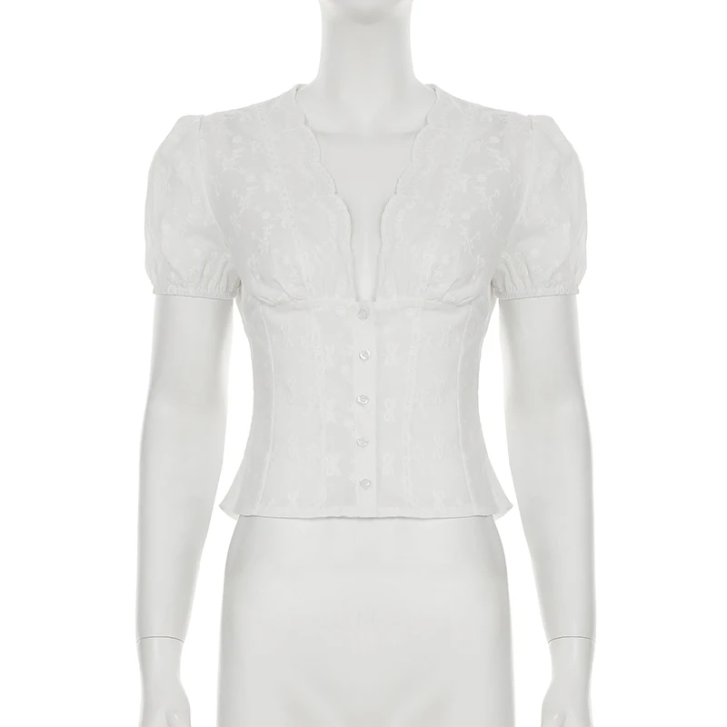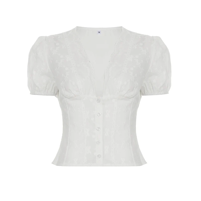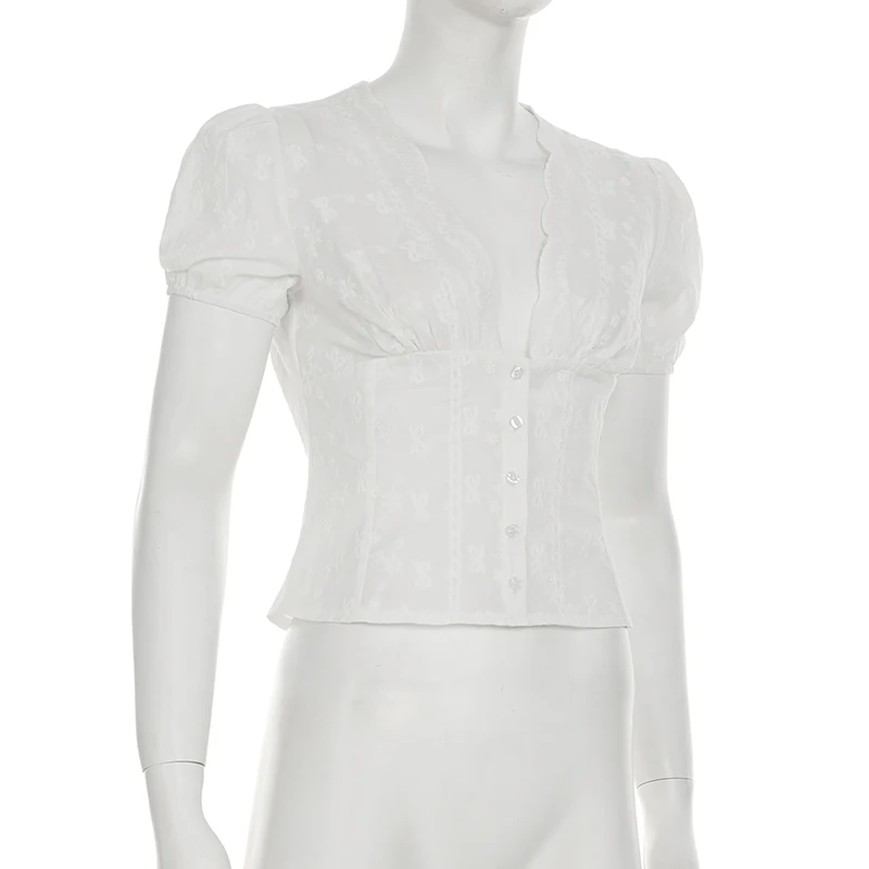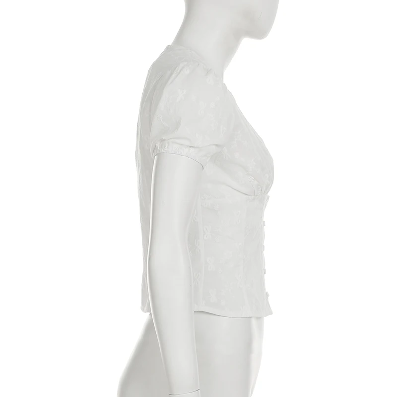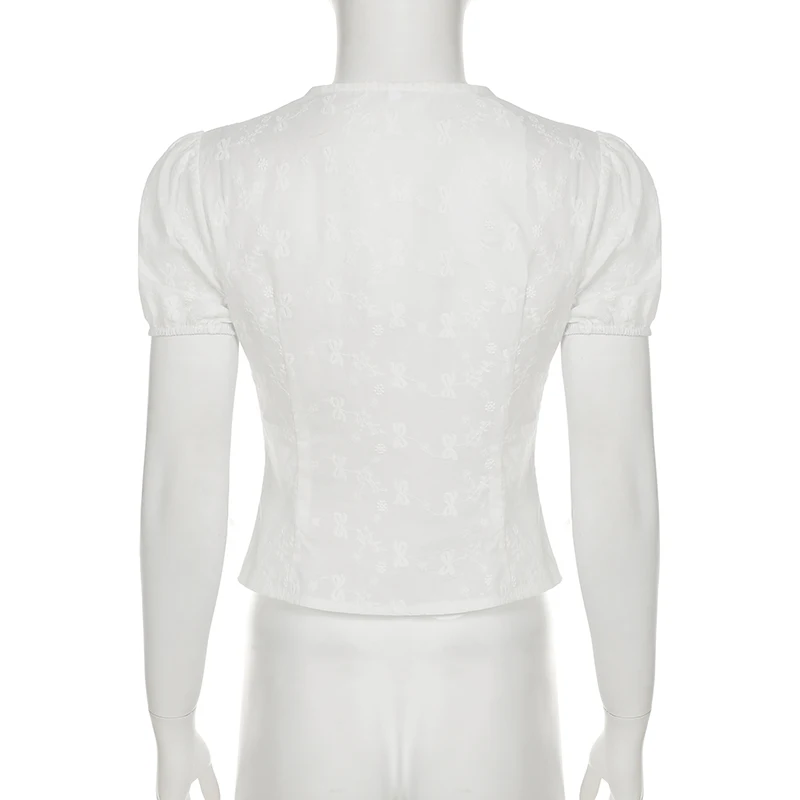 Y2K Bow Textured Waist Cinching Shirts Women Summer Puff Sleeve V-Neck Cardigan Tops Cutecore Button-Fly Girls Blouse