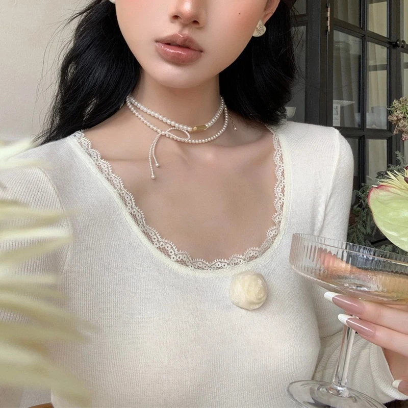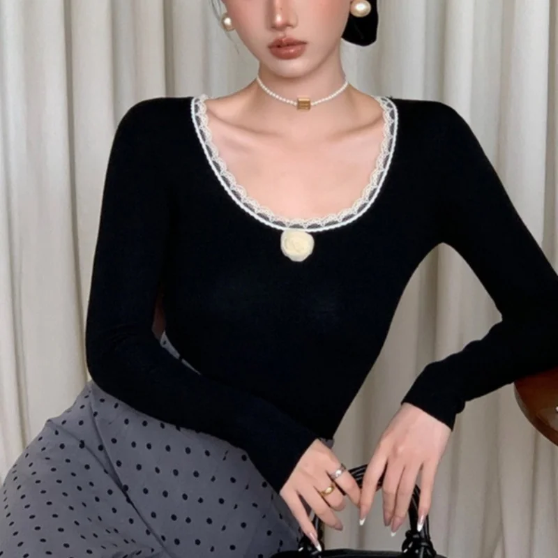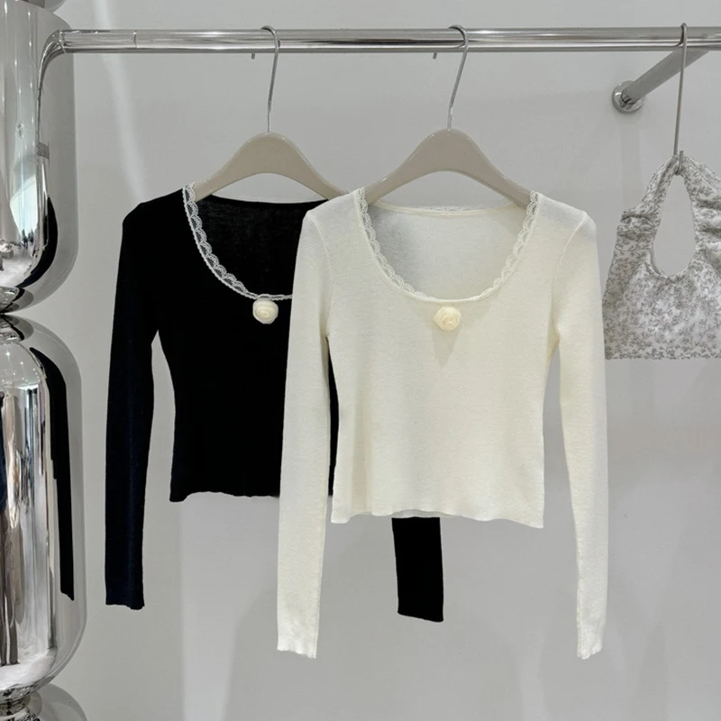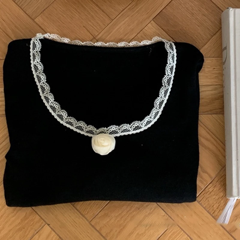 y2k Clothes Tops Women 3D Flower Lace Trim Round Neck Long Sleeve Ribbed T Shirt 2000s Aesthetic Clothing Streetwear