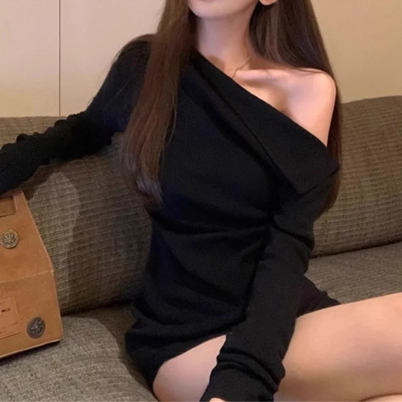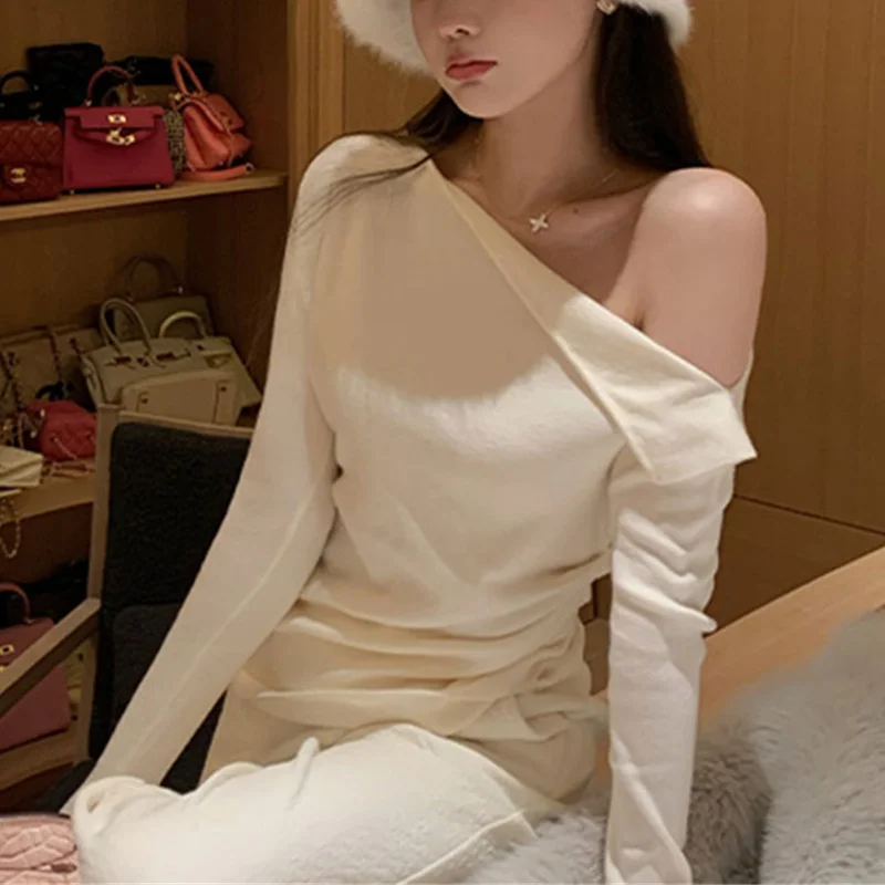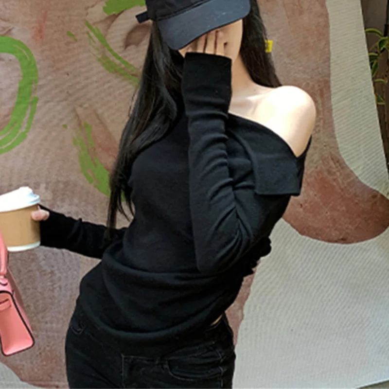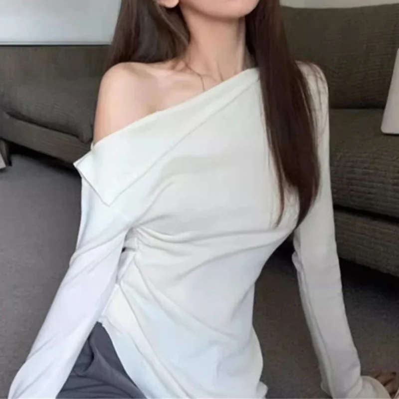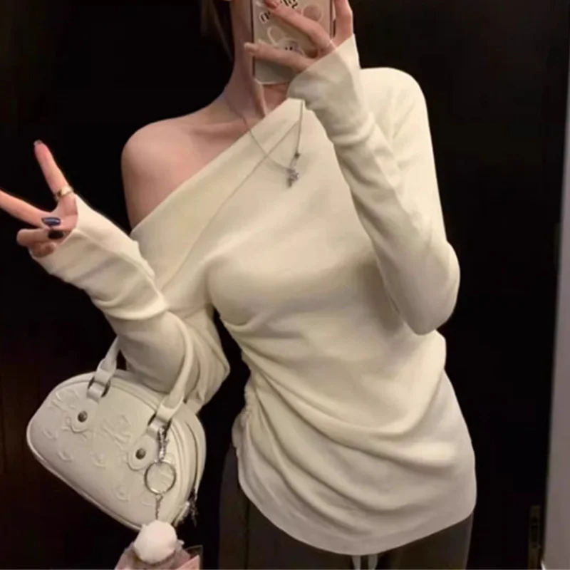 y2k Crop Top Clothing Women Solid Color Slant Neck Off Shoulder Long Sleeve Ruched T Shirt 2000s Clothes Streetwear