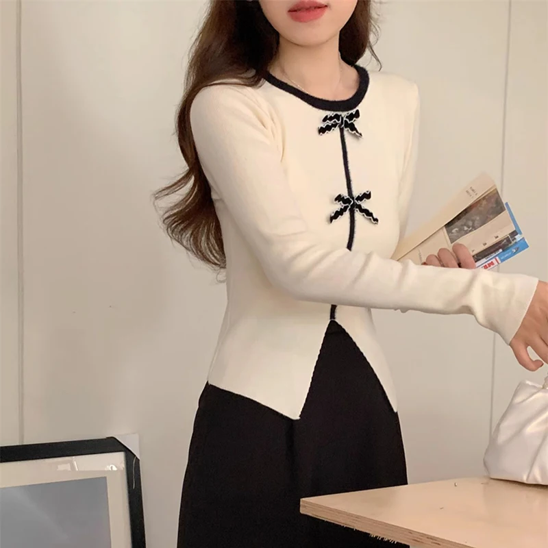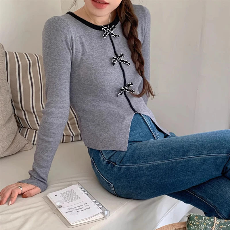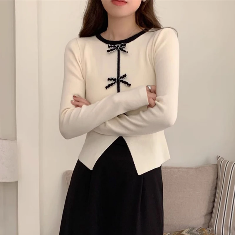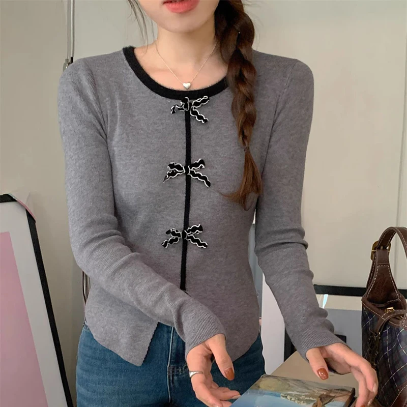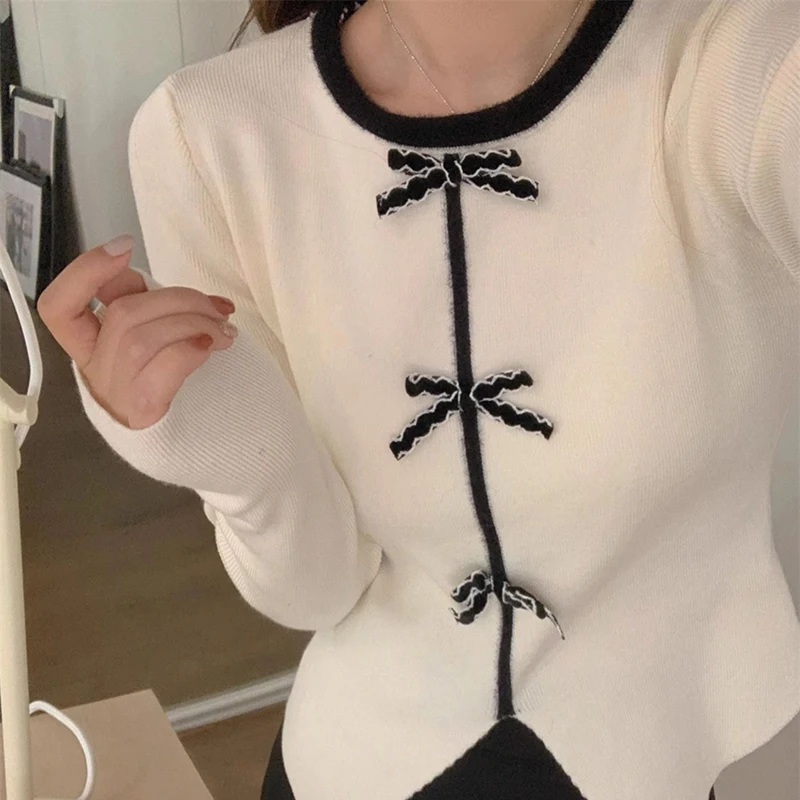 y2k Crop Top Women Fairycore Clothing Round Neck Long Sleeve T Shirt with Bow Decor 2000s Aesthetic Clothes Streetwear