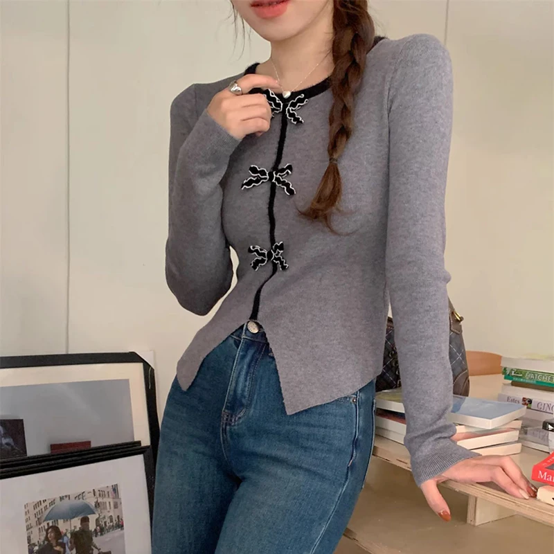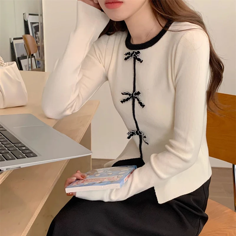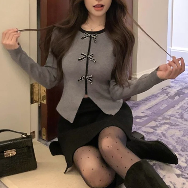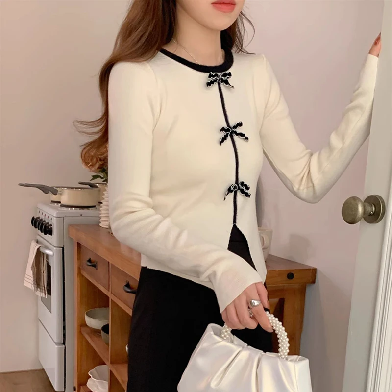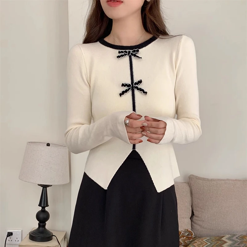 y2k Crop Top Women Fairycore Clothing Round Neck Long Sleeve T Shirt with Bow Decor 2000s Aesthetic Clothes Streetwear