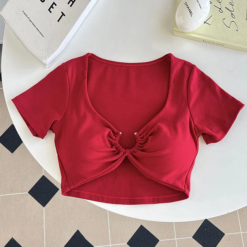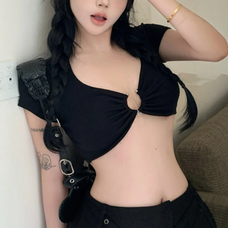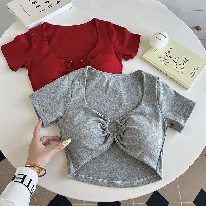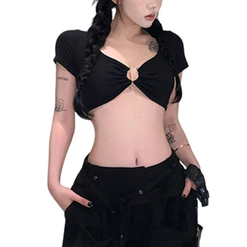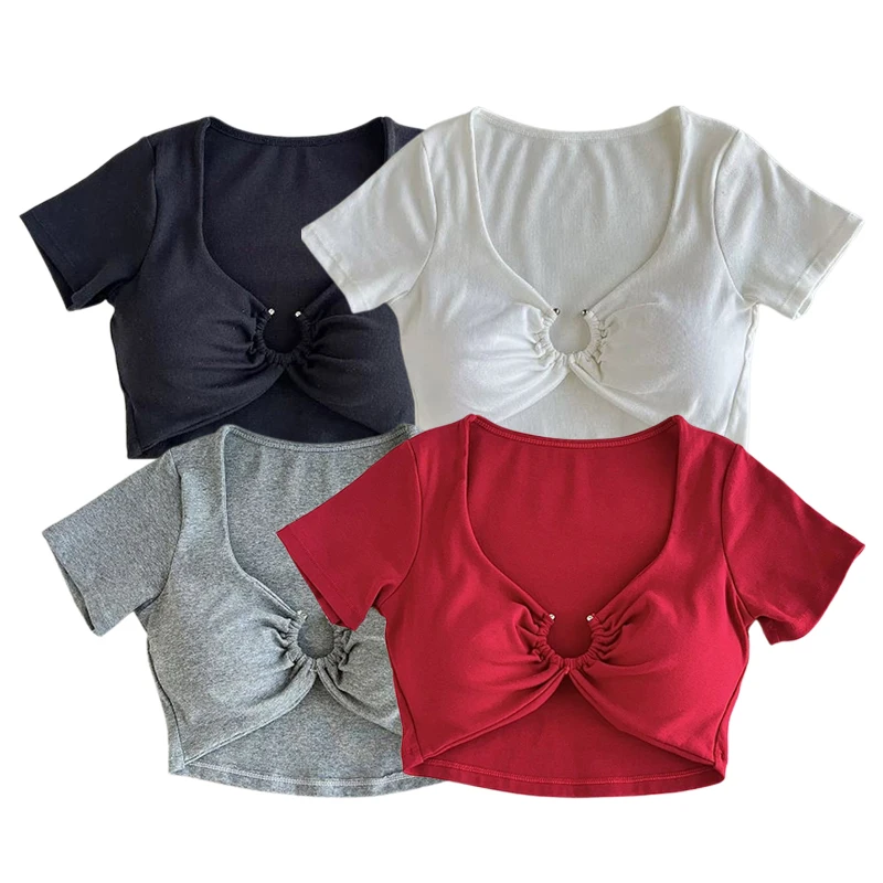 Solid color, short sleeves, metal rings, padded, slim fit, crop length; Basic tops for women; Cute tops for women; Short sleeve crop tops that make you look chic and feel fabulous