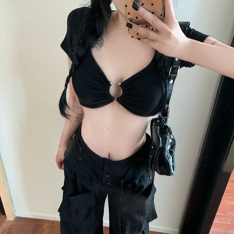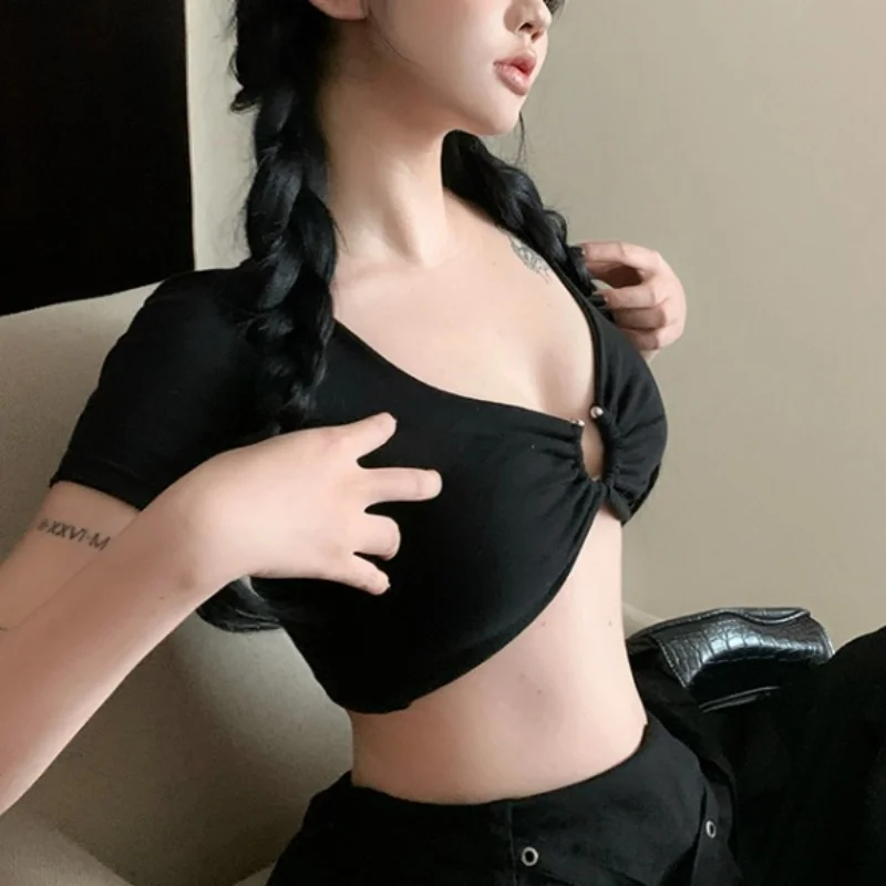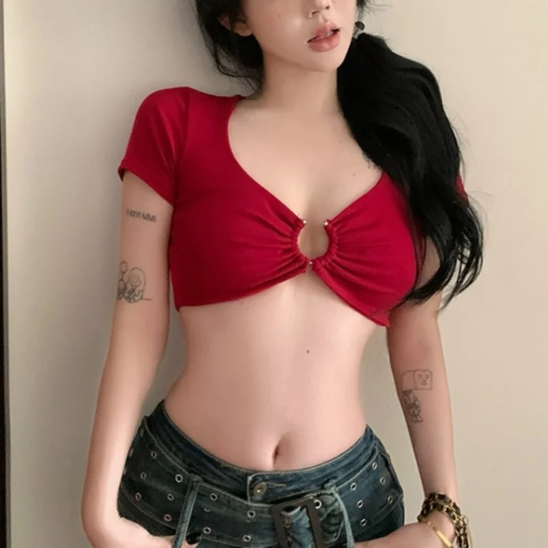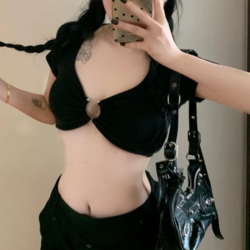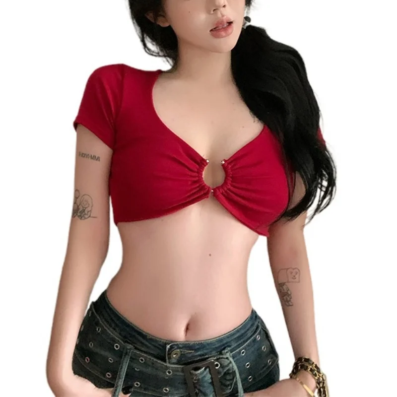 Solid color, short sleeves, metal rings, padded, slim fit, crop length; Basic tops for women; Cute tops for women; Short sleeve crop tops that make you look chic and feel fabulous
