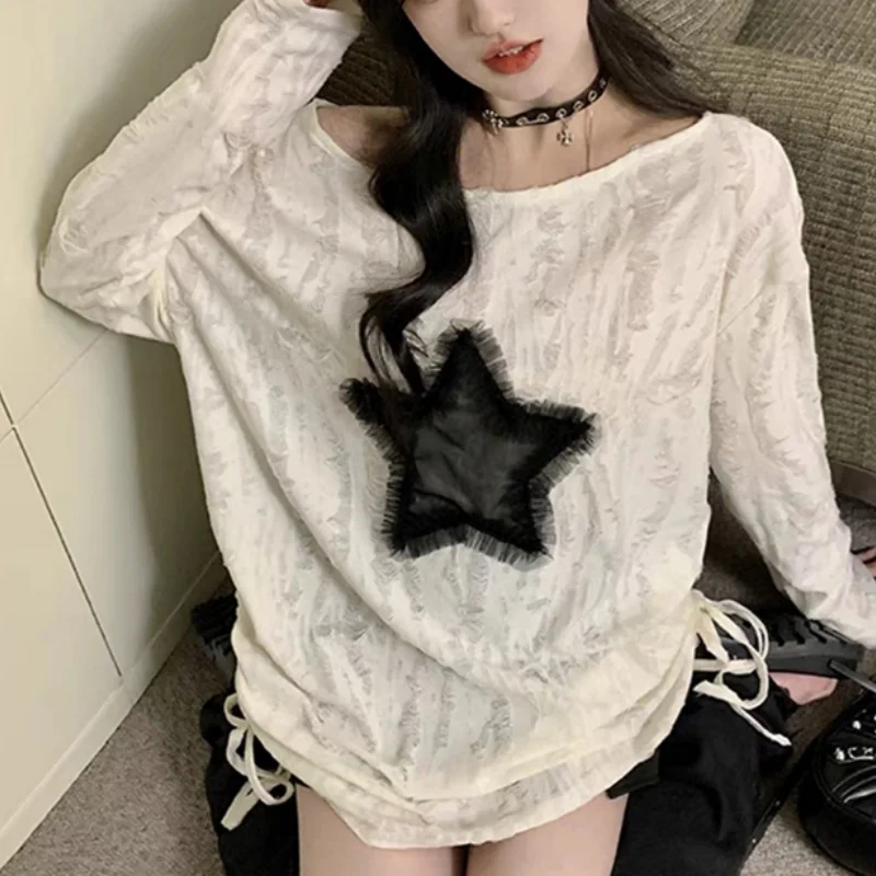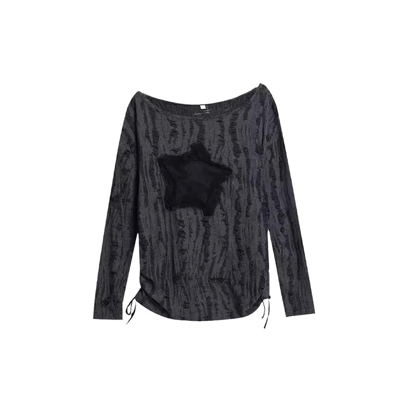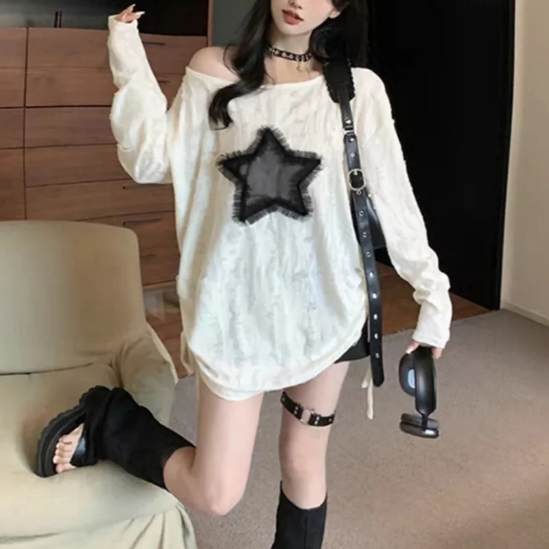 FeaturesFall tops for women with ripped, star patch, long sleeves and side drawstring; Off-shoulder design shows off your delicate neck and makes you look elegant and charming; Loose fit accentuates your body shapeSuitable for casual, daily, dating, wedding, cocktail, party, club, beach, prom, nightclub, bar, vacation and other occasions, elegant and charming.Size (cm)One SizeLength: 70Bust: 116Sleeve: 55Shoulder: 49Size (inch)One SizeLength: 27.56Bust: 45.67Sleeve: 21.65Shoulder: 19.29SpecificationCondition: 100% Brand NewMaterial: 100% Recycled PolyesterStyle: FashionGender: WomenSeason: Summer FallPattern: Star PatchOccasion: DailyPackage Including:1 * Women Off-shoulder Tops Note:There may be 1-2 cm deviation in different sizes, locations and stretch of fabrics. Size chart is for reference only; there may be a little difference with what you get. Color may be lighter or darker due to the different PC display.