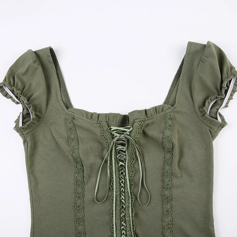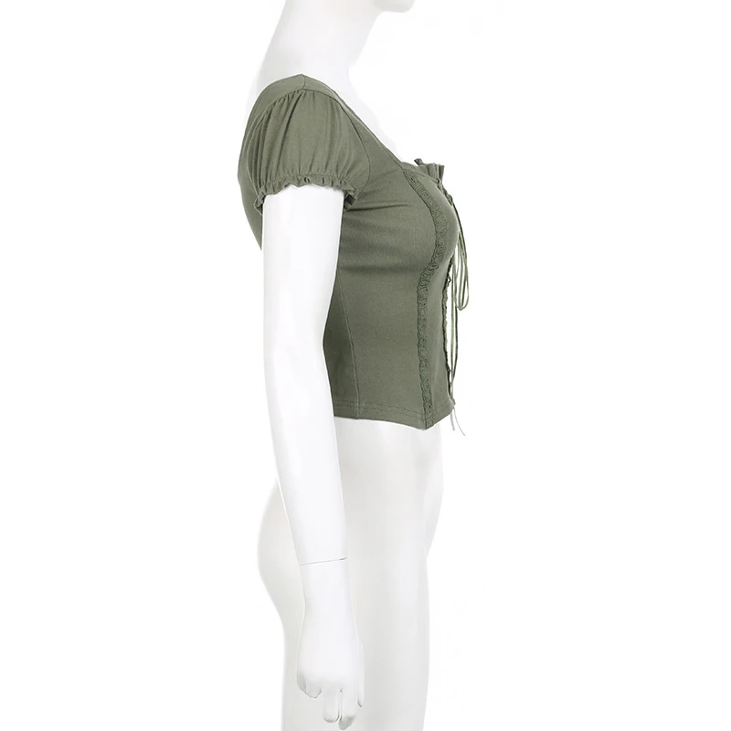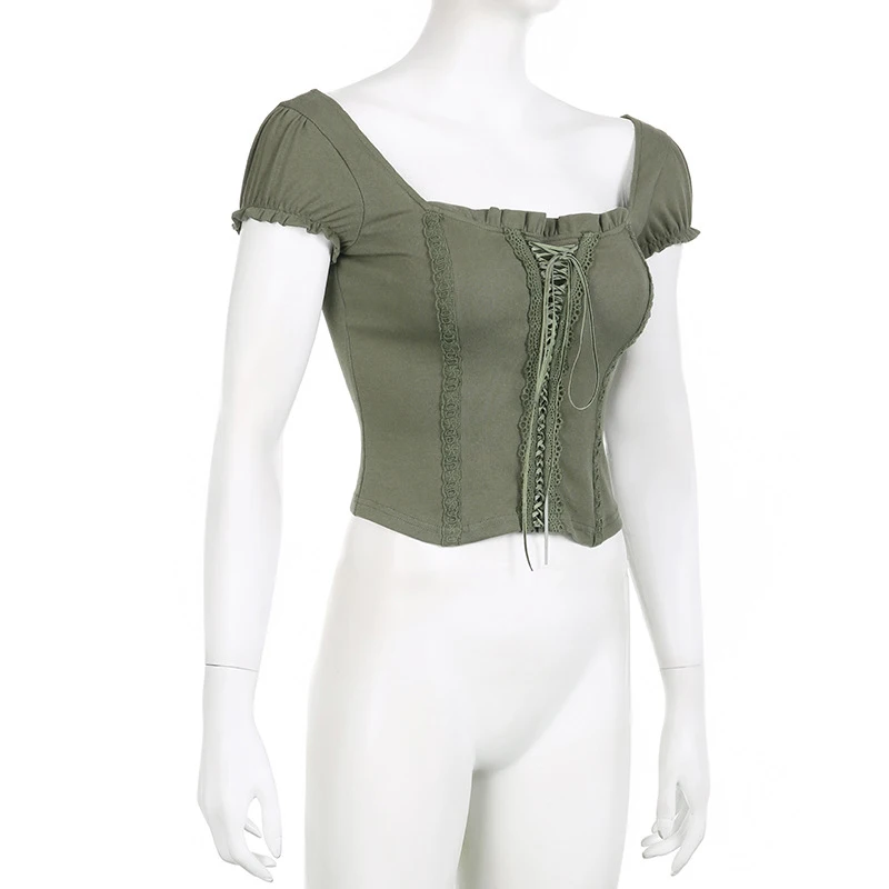 y2k Green Lace Crop Top Trim Square Collar Short Sleeve T Shirt Women Fairycore Balletcore Chic Tee Summer Korean 90s