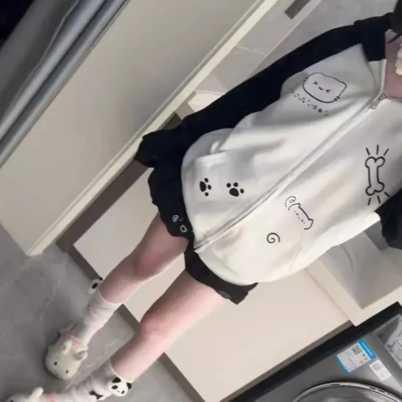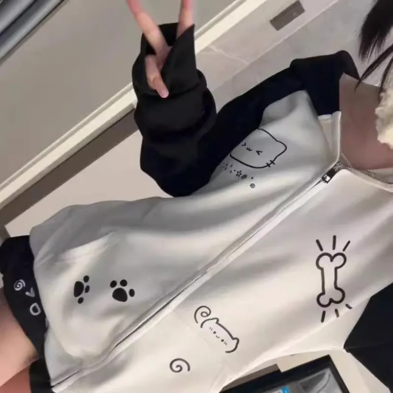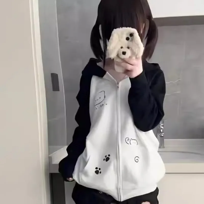 Y2k Japanese Hoodies Women Contrast Color Cute Y2k Tops 2024 Ropa Mujer Cat Print Casual Sweatshirts Anime Zipper Hooded Hoodie