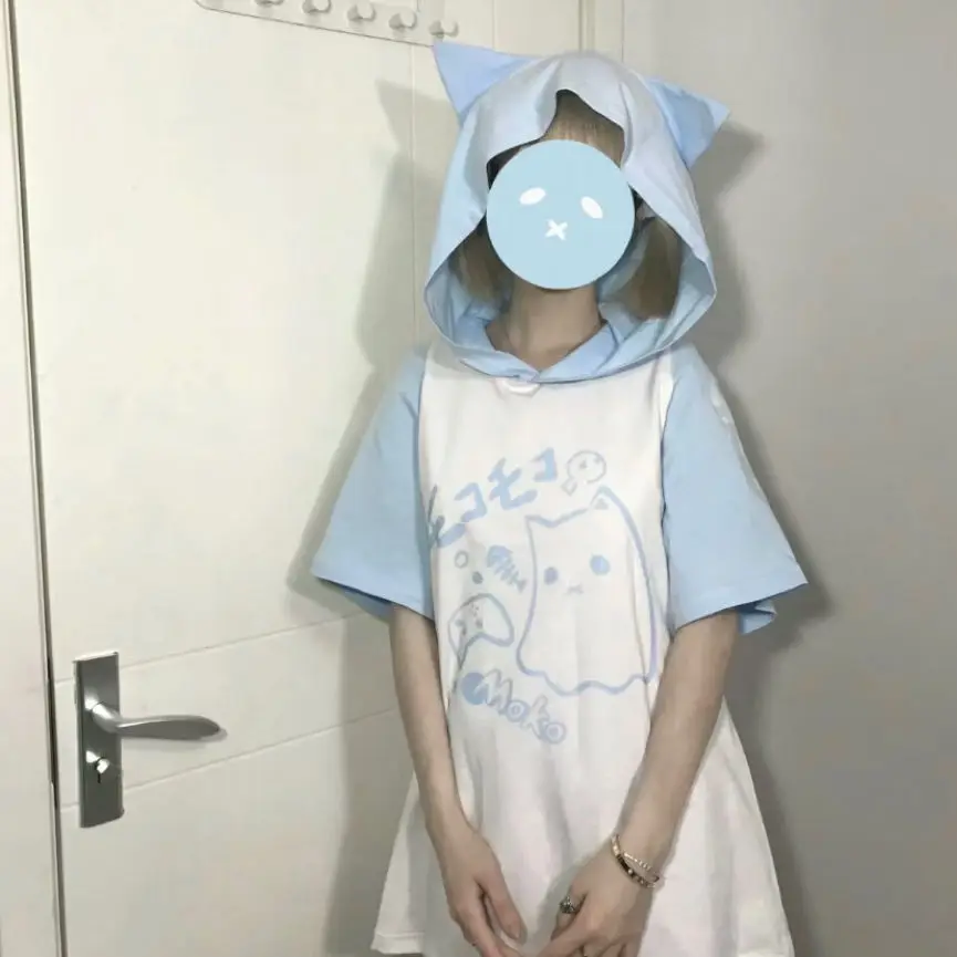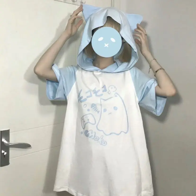 Y2k T Shirts for Women Hooded Anime Print Short Sleeve Tees Japanese Camisetas Cute Summer Tops Casual Fashion Oversized Tshirt