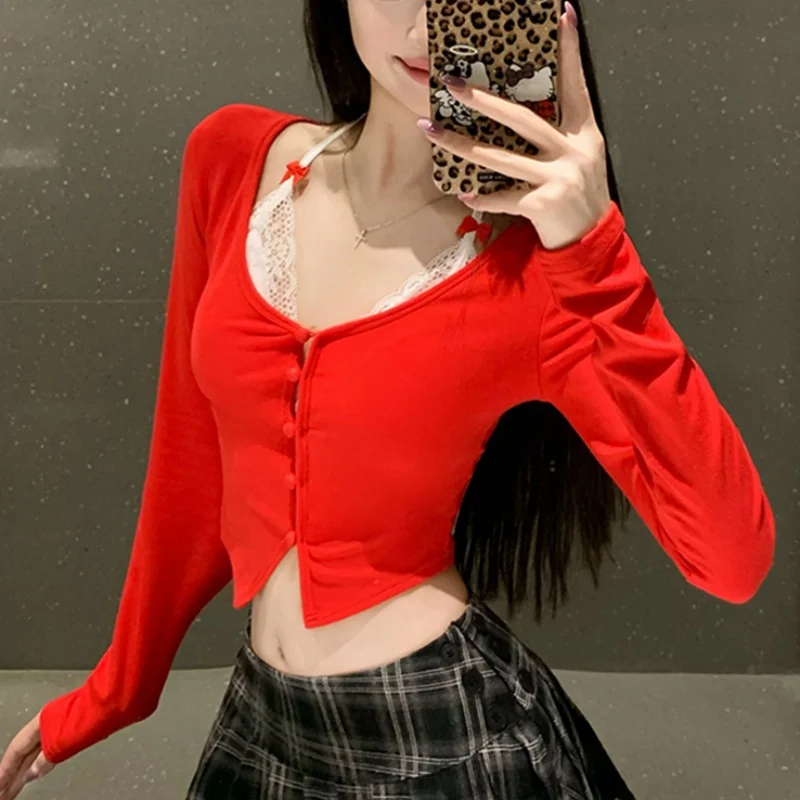 y2k Tops Women Aesthetic Clothes Contrast Color Lace Patchwork Long Sleeve Tshirt with Bow Coquette Clothing Streetwear