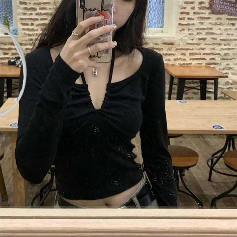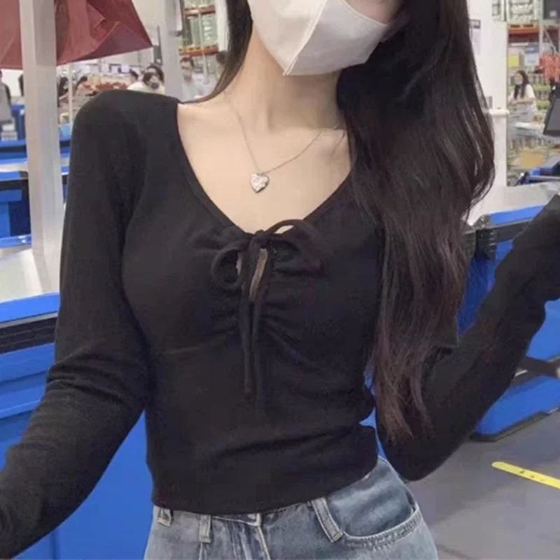 y2k Tops Women Aesthetic Clothing Solid Color V Neck Long Sleeve Cropped T Shirts 2000s Coquette Clothes Streetwear