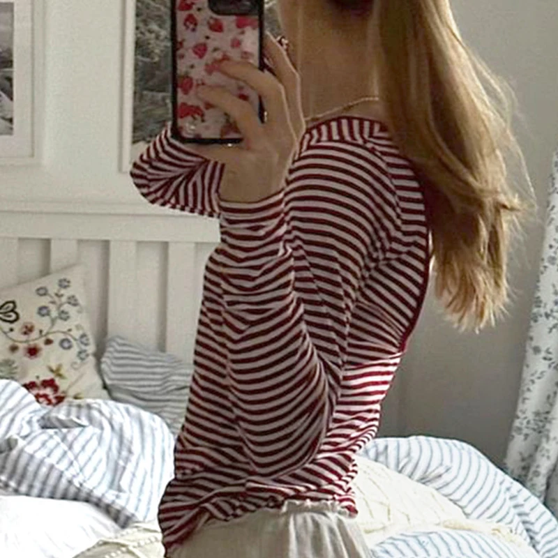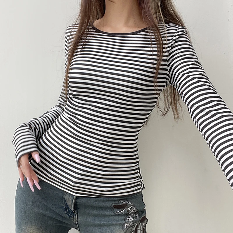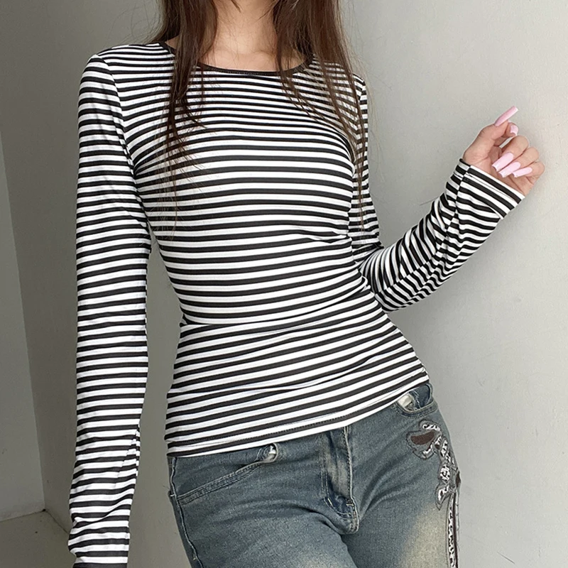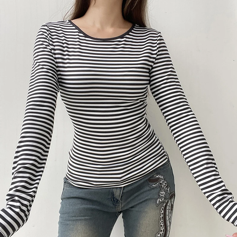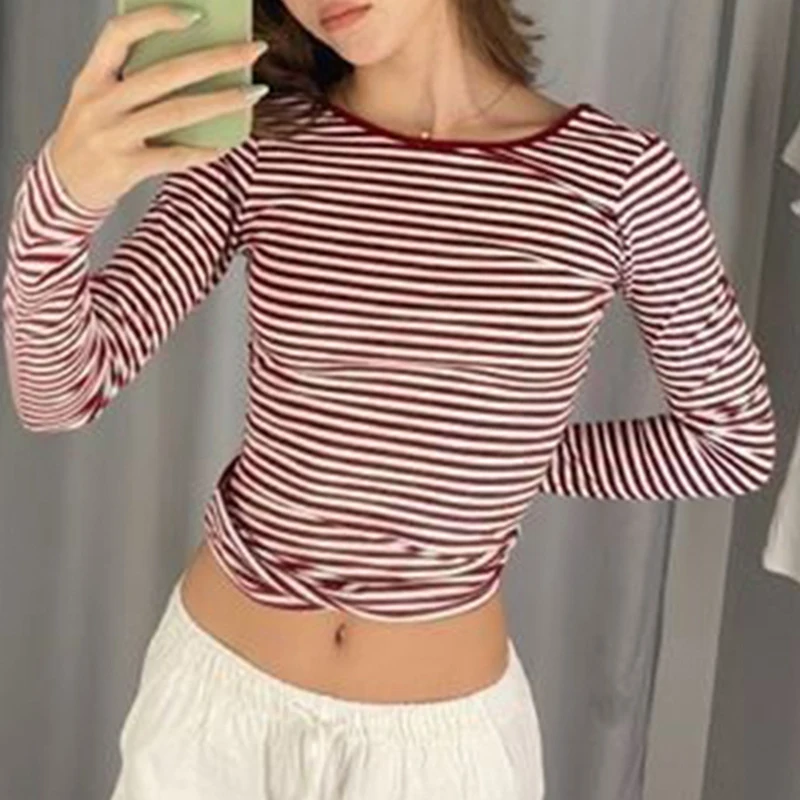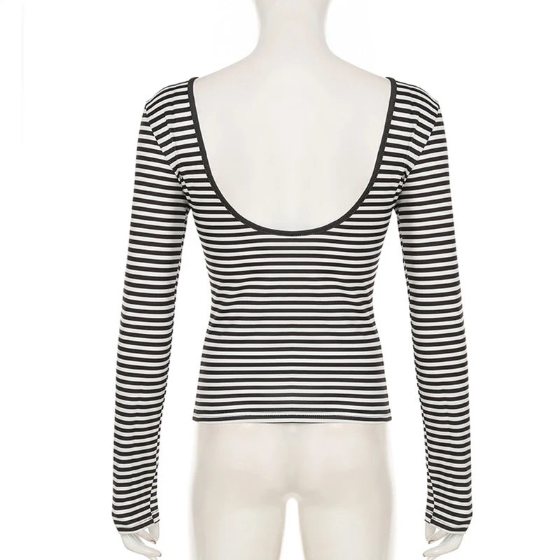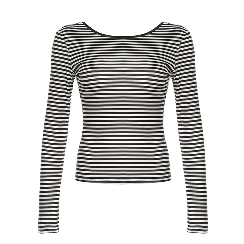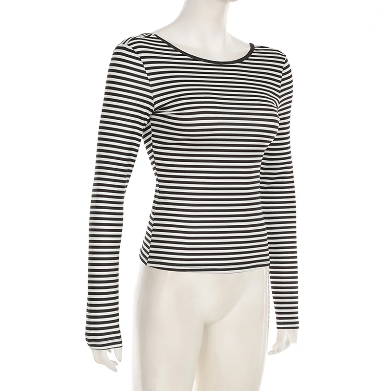 y2k Tops Women Grunge Clothes Casual Striped Round Neck Backless Long Sleeve Tee Shirts 2000s Clothing Streetwear