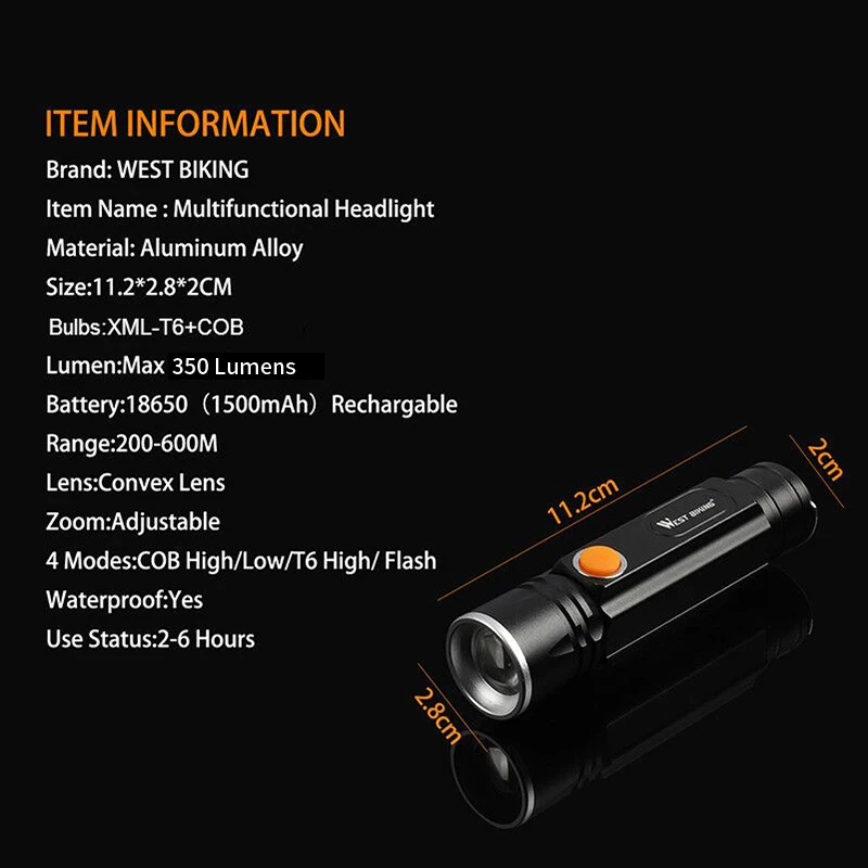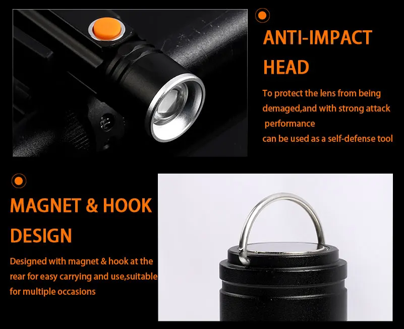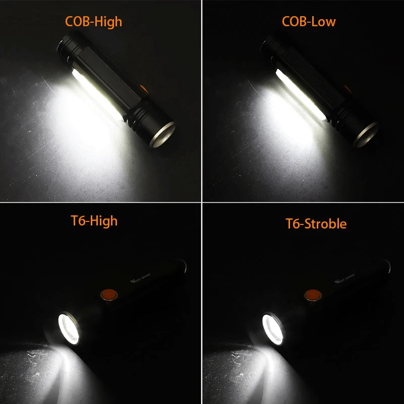 • Portable flashlight with 3 lighting modes: high, low and strobe